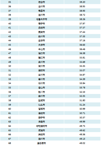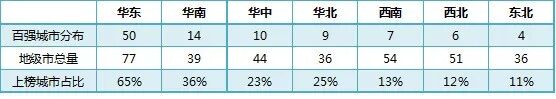 地区的城上榜率高达65%,即每3个华东城市中,就有2个城市进入“双创”金融指数综合百强榜单。华南地区表现仅次于华东,百强城市榜中有14个城市来自华南地区。