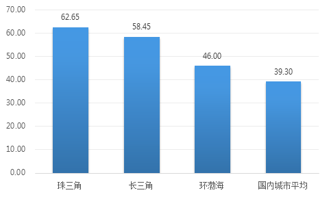 珠三角9市的“双创”金融指数综合平均得分最高,达到了62.65分,高出国内城市平均得分约60%。其中,深圳和广州保持珠三角区域发展领先地位,两者分别排名全国第3和第5。