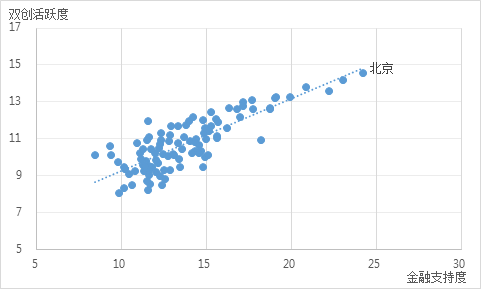 应用“双创”金融指数百强城市的特征数据,可以发现两者的相关系数达到了0.824,这说明“双创”活跃度与金融支持度之间有非常强的相关性。某种意义上可以说,金融对“双创”活动的服务支持越强,创新创业的活跃程度就越高。